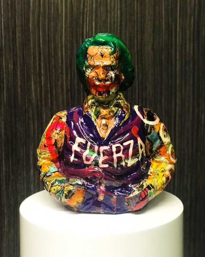Escultura en cerámica adornada con comics y pintura, con un terminado gloss. Incluye un soporte en madera de 2 cm de grueso, pintado en poliuretano blanco.